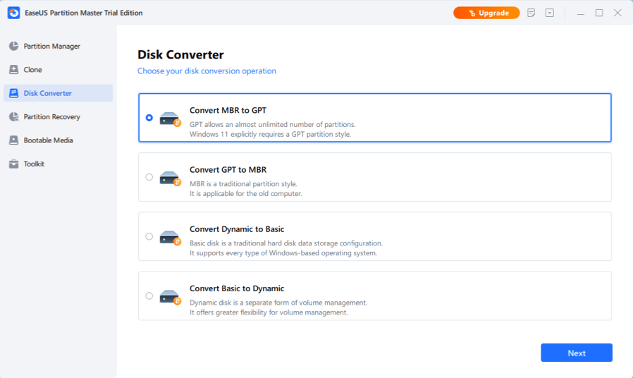 可能有两个原因: 1)请检查系统磁盘上是否已经有4个主分区。如果是,请删除一个分区或将其转换为逻辑分区,然后再次尝试转换。 2)请检查系统和启动分区是否位于不同的磁盘上。如果是,请手动将它们合并到同一个磁盘上。您可以联系我们的技术团队以获得进一步的帮助。